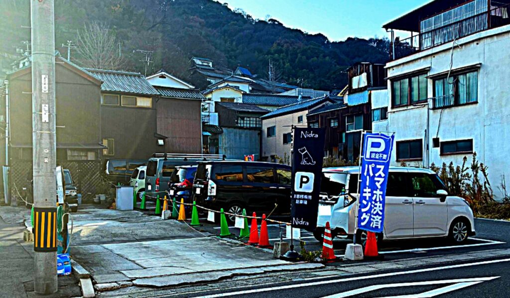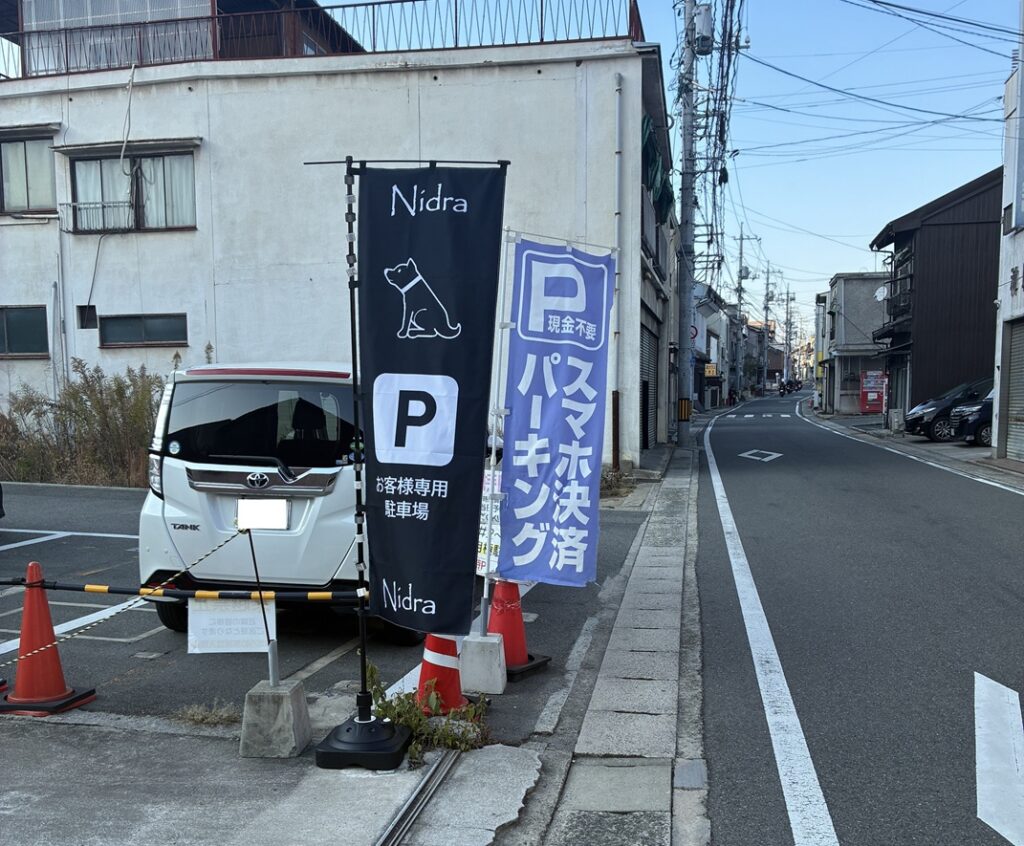Nidra専用駐車場に入れます。縁石があるので、少し左に避けながら進入ください。